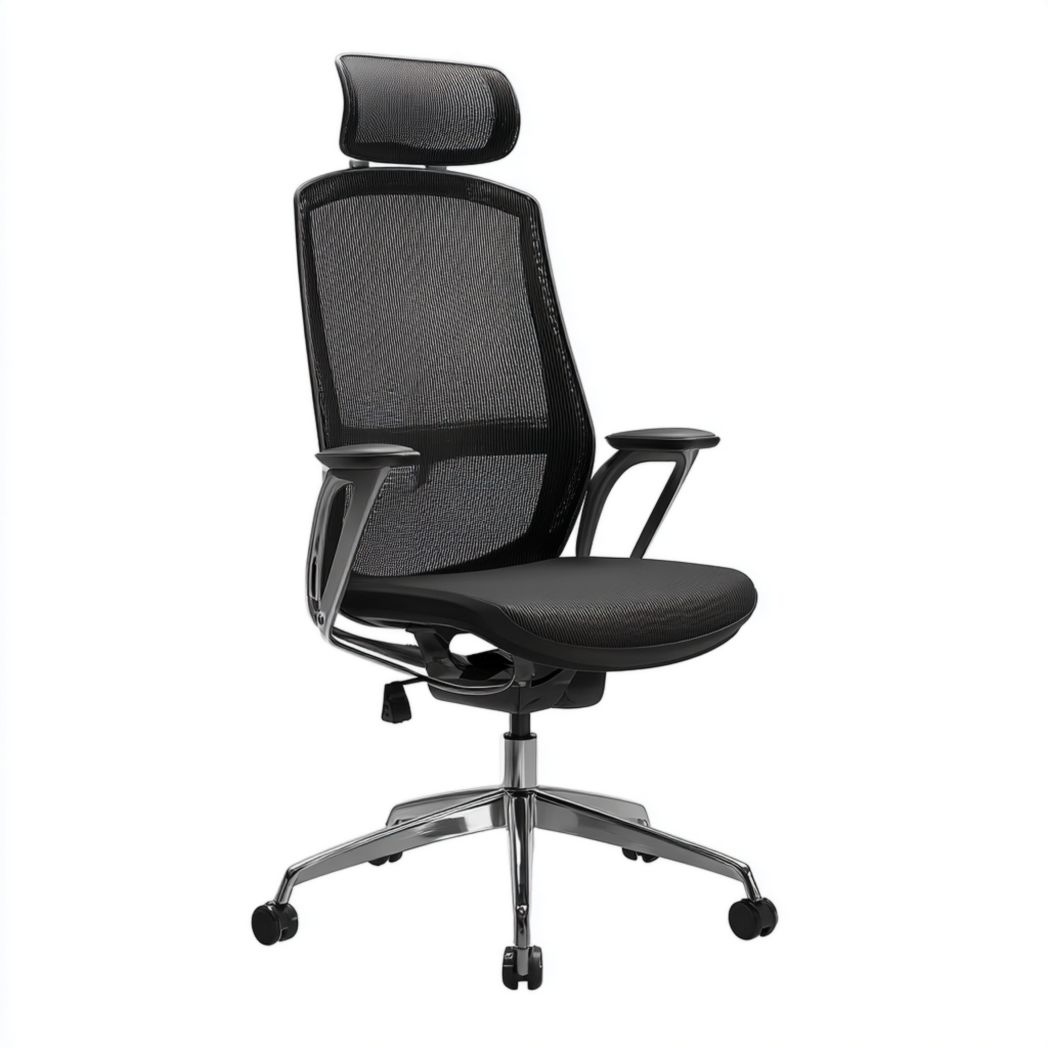 Chaise de bureau pivotante avec dossier en maille, appui-tête et piètement chromé - Noir
