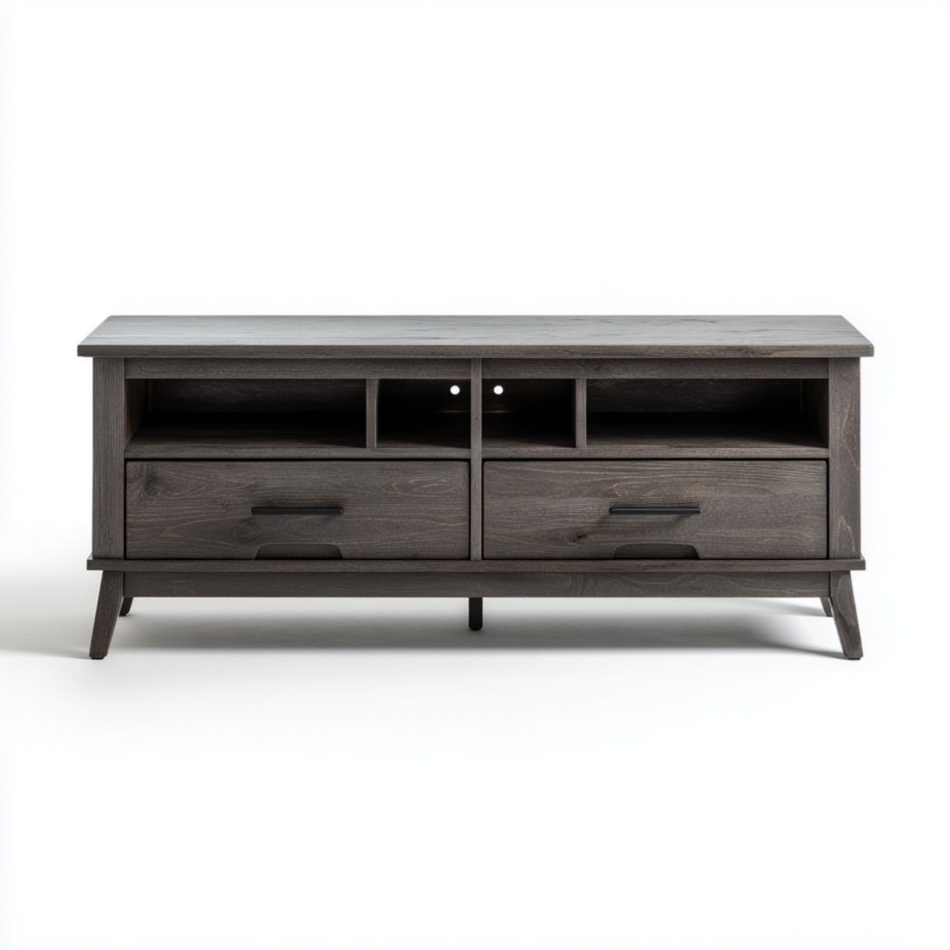 Meuble TV en bois gris avec deux tiroirs et quatre niches de rangement